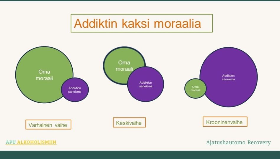Itse kuvaan asian kahden rinnakkain elävän moraalin kautta. Sairauden edetessä oma moraali jää yhä selkeämmin addiktion vääristämän moraalin jalkohin. Tämän kirjoituksen pohdinta on omaani ja kumpuaa raitistumiseni alusta 2012 saakka.